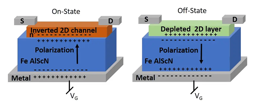 ⬆️ Schematic of the experimental AlScN FeFET in On- and Off-States; the blue part represents the AlScN film. (Image Credit: University of Pennsylvania)