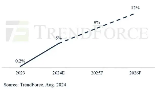 TrendForce estimates that this year, the AI-related SSD procurement capacity will exceed 45EB. In the coming years, AI servers are expected to drive an average annual growth rate in SSD demand of over 60%, with AI SSD demand likely to increase from 5% of total NAND Flash demand in 2024 to 9% in 2025.