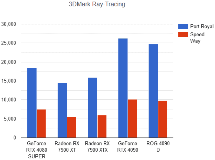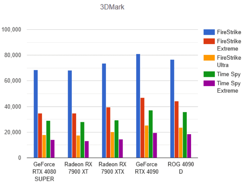 3DMark difference between the GeForce RTX 4090D, the GeForce RTX 4090,GeForce RTX 4080 SUPER, Radeon RX 7900XT and Radeon RX 7900 XTX