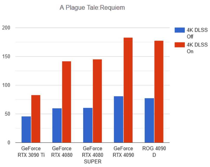 A Plague Tale Requiem between GeForce RTX 3090 Ti, GeForce RTX 4080, GeForce RTX 4080 SUPER, GeForce RTX 4090, and ROG 4090D