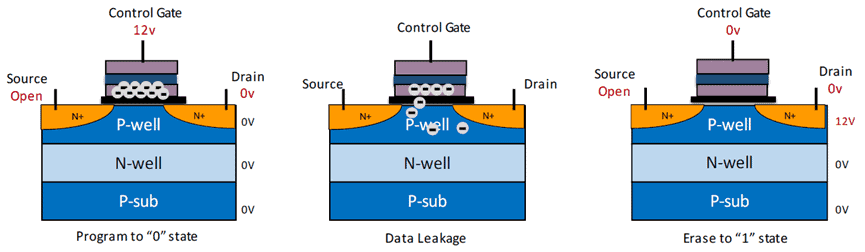 According to the working principle of NAND flash, if there is no read/write operation for a long time, the overlying memory cell will gradually lose its stored charge at the floating gate level, resulting in a change in the original stored data, e.g. Data “0” may change to “1” in the figure. When the data errors reach a certain number and exceed the SSD’s error correction capacity, the data will be completely corrupted.