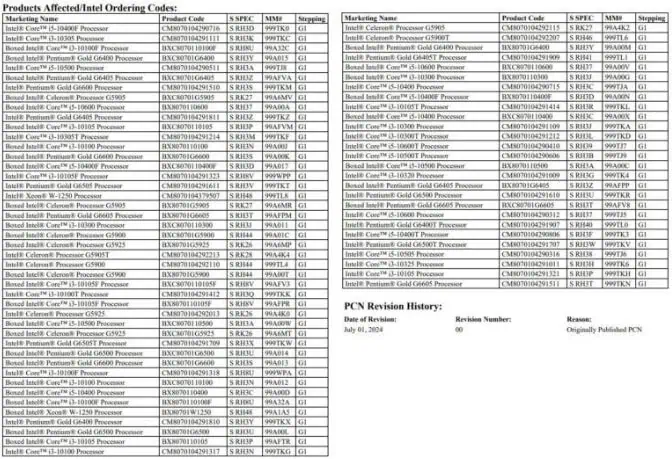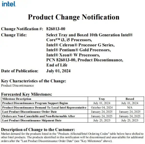 On July 1, Intel announced (as shown in the image) that they would discontinue several processors, mainly including the entire series of 10th generation Core desktop processors (codenamed Comet Lake and using the 14nm process) and entry-level workstation processors Xeon W-1250, among about 30 models (see the image for details).