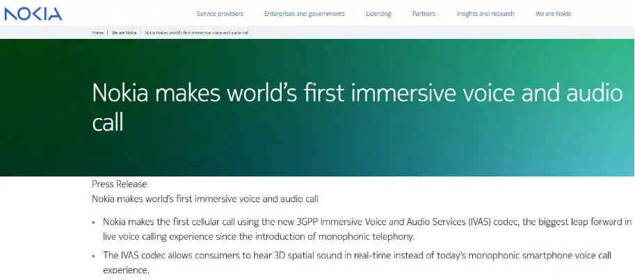 Reportedly, the 3GPP IVAS codec standard was developed by an alliance of 13 companies under the IVAS codec public cooperation framework, with Nokia being a key participant and contributor. Nokia has provided major technological contributions to this standard, including developing smartphone-specific formats for the IVAS standard.
