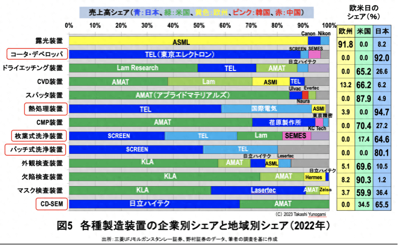 In the field of semiconductor materials, Japan holds a very high market share in the production of materials substrates required for semiconductor chip manufacturing, such as silicon wafers, photoresist materials, various CMP polishing fluids, and various chemical agents (see Figure 4). Additionally, in the equipment sector, though not in all areas, Japan also has a significant market share in fields like photoresist coating and developing equipment, heat treatment equipment, batch cleaning equipment, and Critical Dimension Scanning Electron Microscopes (CD-SEM) (see Figure 5).