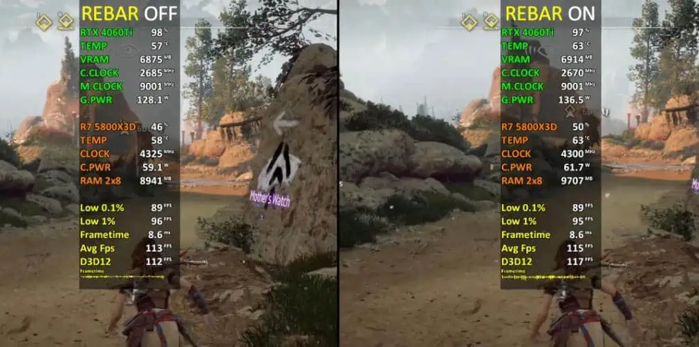 “Horizon Zero Dawn” shows a very slight improvement with Resizable Bar enabled, indicating minimal performance gains.