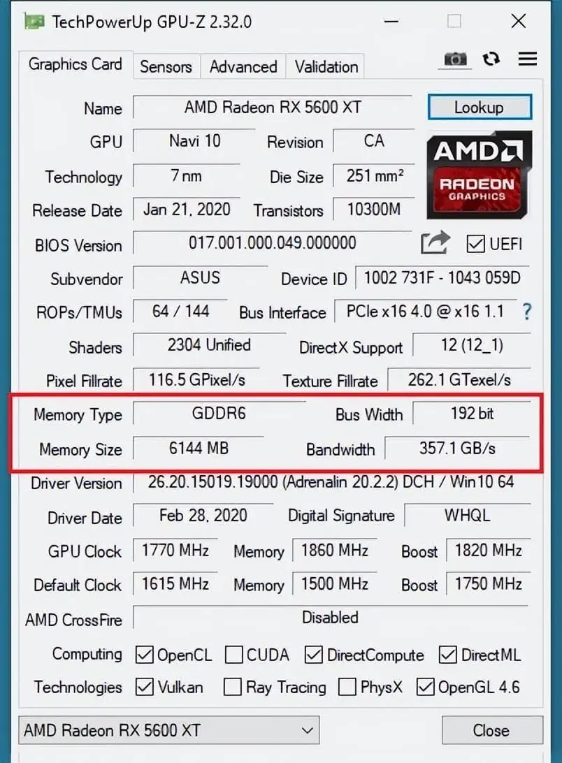 The RX 5600 XT was released in January 2020, utilizing the first-generation RNDA architecture, with a Navi 10 XLE GPU core, 2304 stream processors, and equipped with 192-bit bandwidth, 6GB GDDR6 memory.