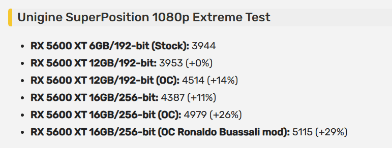 Paulo Gomes used a Sapphire RX 5600 XT and, by adding hexadecimal input instructions to the video memory BIOS, unlocked the blocked 64-bit bandwidth and tried different memory capacities of 6GB, 8GB, 12GB, and 16GB, respectively testing with Unigine SuperPosition 1080p Extreme.