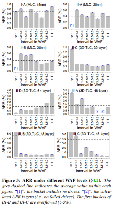 Figure 3 illustrates the correlation between WAF and failure rate for eight popular drive series, including different types of NAND and manufacturers. Firstly, for WAF values greater than 1, no strong positive correlation between WAF and ARR (Annual Replacement Rate) was observed in most drive families (with the II-D drive family being an exception). This suggests that NVMe SSDs are less affected by random small writes, which are the main cause of high write amplification. Secondly, for drives with low WAF (i.e., WAF ≤ 1), their failure rates remain relatively high. On average, the ARR rates for these low WAF drives could be 2.19 times higher than the average level.