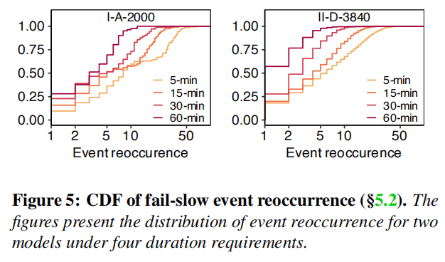 Next, we determine if the selected drives are indeed fail-slow by checking for a consistent slowdown. Suspected fail-slow drives are identified if, in events, their speed is at least twice as slow as their peers. This is assessed by comparing the slowdown ratios with a minimum span of 5, 15, 30, and 60 minutes, indicating comparisons of drive speed within these intervals with their peers. Table 5 shows the slowdown ratios, the percentage of drives identified as fail-slow in the model, and the frequency of events per hour per 1000 drives, which reflects the severity of fail-slow in a medium-sized cluster. The last two columns, Duration and Event Latency display the average duration and average event latency of fail-slow events. The final row in each quadrant represents the average for each category (e.g., SSD or HDD).