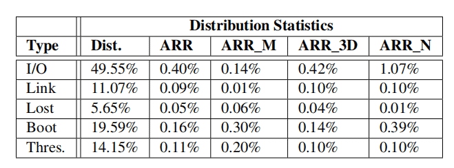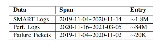 - Failure tickets: Each node in the cluster is configured with a daemon to monitor and report stoppage failures. Upon reporting, a failure ticket is generated (manually reviewed by engineers), containing basic information about the affected drive (e.g., model and hostname) and timestamp.