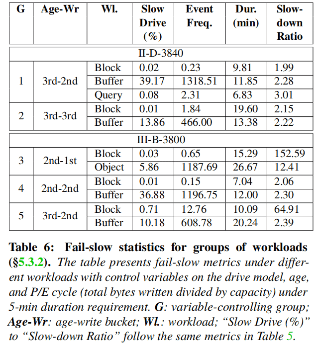 By comparing the metrics within each group, it can be observed that the workload can significantly impact all four fail-slow indicators. For example, in Group 1 and Group 2, the fail-slow population and event frequency for caching workloads may be thousands of times higher than that of block storage (e.g., 39.17% vs. 0.02% in Group 1). Similar differences can be observed in event duration and slowdown ratio between block storage and object storage in Group 3 or between block storage and caching in Group 5.