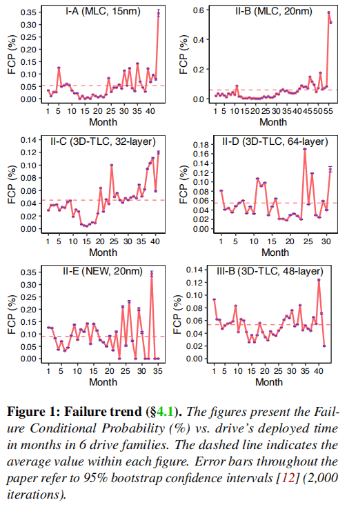 To support this conclusion, this article employs the monthly Failure Condition Probability (FCP) to illustrate the failure trend. FCP is calculated by dividing the number of drives replaced in a given month by the number of surviving drives in that month. Figure 1 presents the statistics for six popular families. Upon visual inspection, it can be observed that most families do not exhibit a significant infant mortality rate during the early stages.