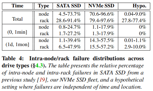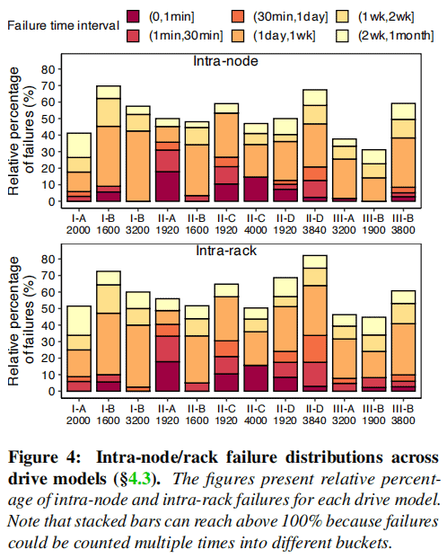 Discovery: Spatially correlated (node-to-node/intra-rack) NVMeSSD failures exhibit temporal dependency over longer time spans (i.e., 1 day to 1 month) but are no longer prevalent over shorter time intervals.
