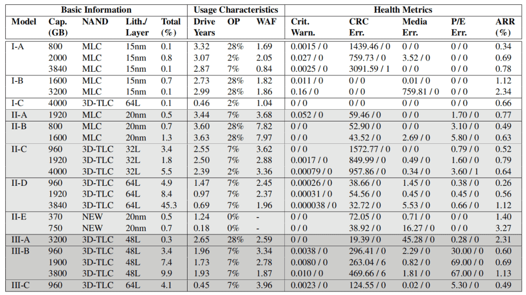 In the basic information, this article names the drive model as Manufacturer-Model and represents the generation of the manufacturer in alphabetical order (e.g., I-A represents the earliest model of Manufacturer I). Each model can be differentiated by capacity and NAND architecture. II-E is a unique case as it adopts a new type of cell (neither planar nor 3D stacked) and is thus named NEW (anonymous). Finally, the relative overall percentage (i.e., total %) is listed for each model.