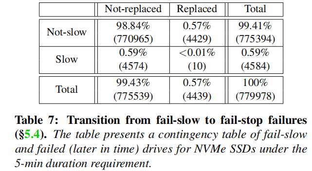 Table 7 is an example contingency table that records the frequency count of drives based on two categories: appearing in the failure log (replaced column) or not appearing (not replaced column), considering at least one fail-slow event (slow rows) or not (non-slow rows). The results are quite surprising, as only 10 drives experienced fail-stop failures before the fail-slow failures. The numbers are relatively small in both the slow drives (approximately 0.22%) and the replaced drives (approximately 0.23%). The average and median transition times were 73 days and 67 days, respectively. One possible reason is that fail-stop failures are rare, or it may take a significant amount of time for the transition from fail-slow to fail-stop. Therefore, we conclude that the transition from fail-slow to fail-stop is unlikely to occur, at least within a few months.