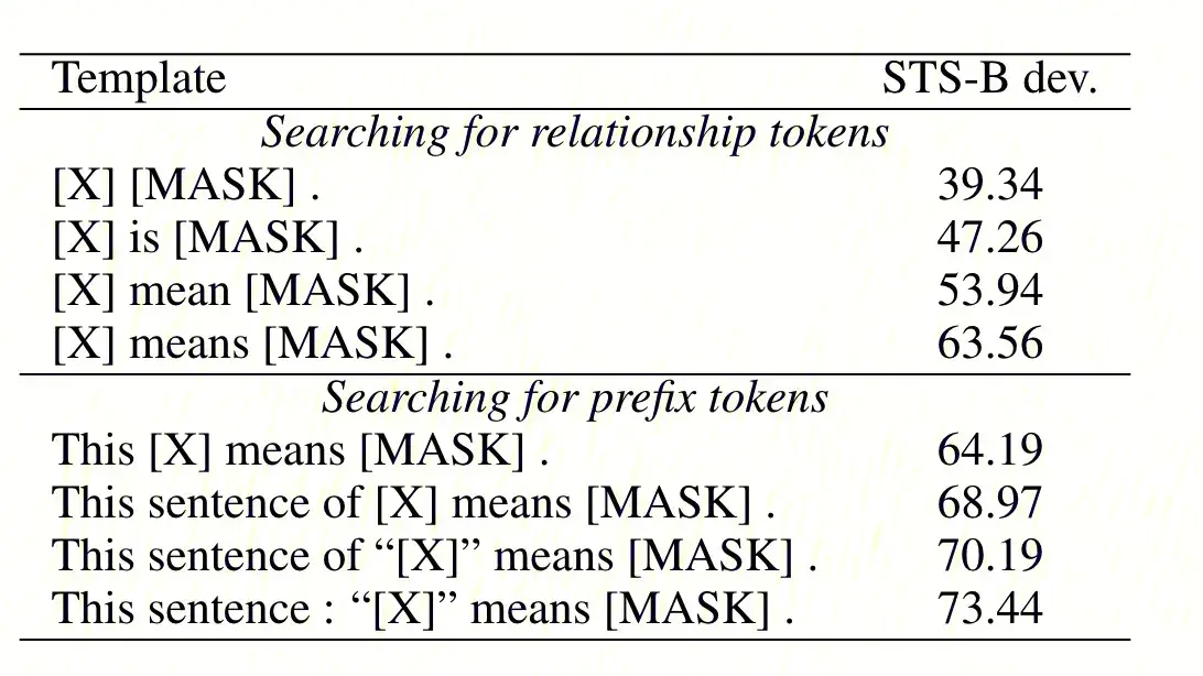 - Generating sentence representations using the prompt format, for instance, ‘[X] means [MASK]’, where ‘[X]’ represents the input sentence and ‘[MASK]’ denotes the output representation, thereby using it as the sentence representation.