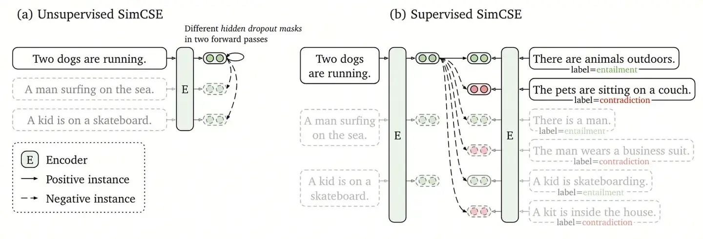 - The supervised version of SimCSE is based on NLI (Natural Language Inference) datasets to construct positive and negative samples. Positive examples consist of sentence pairs with entailment relationships, while negative examples consist of sentence pairs with contradiction relationships (difficult negatives) and in-batch negatives.