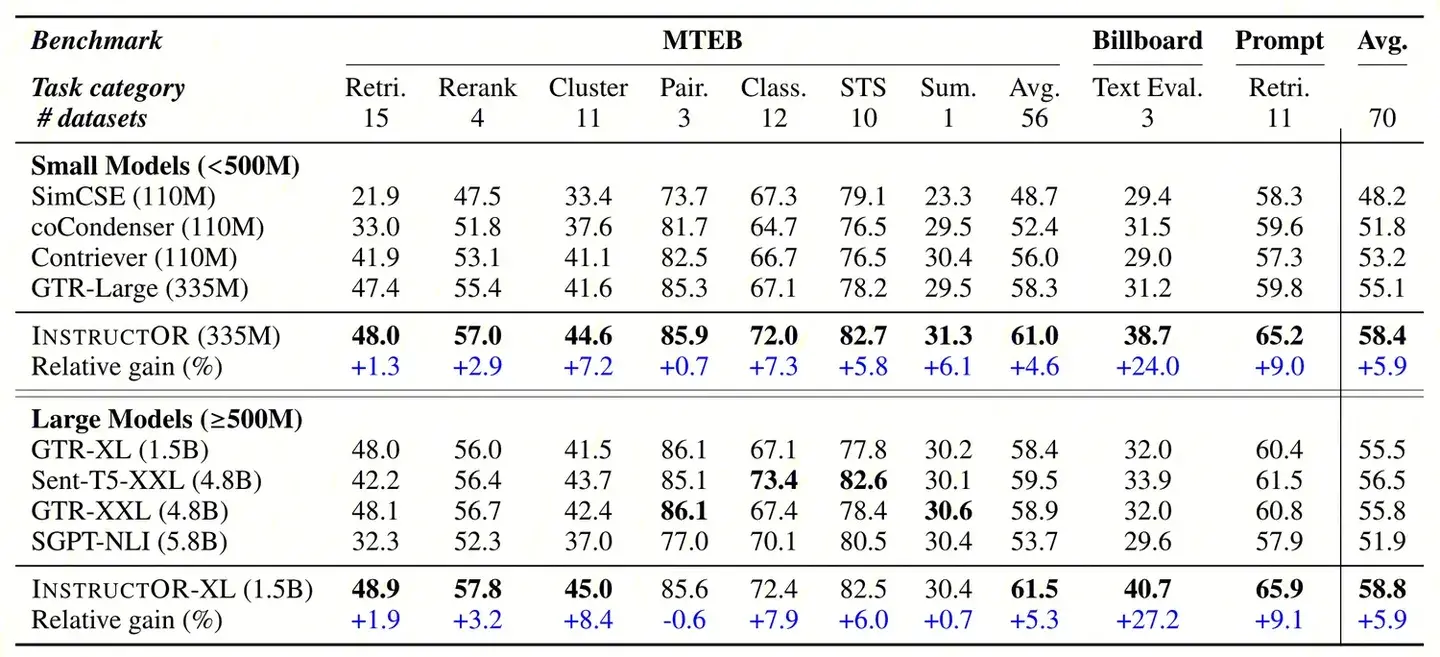 Regarding the second question, the Instructor Embedding paper also provides comparative experiments on the effectiveness of models with different parameter quantities, as shown in the following table: